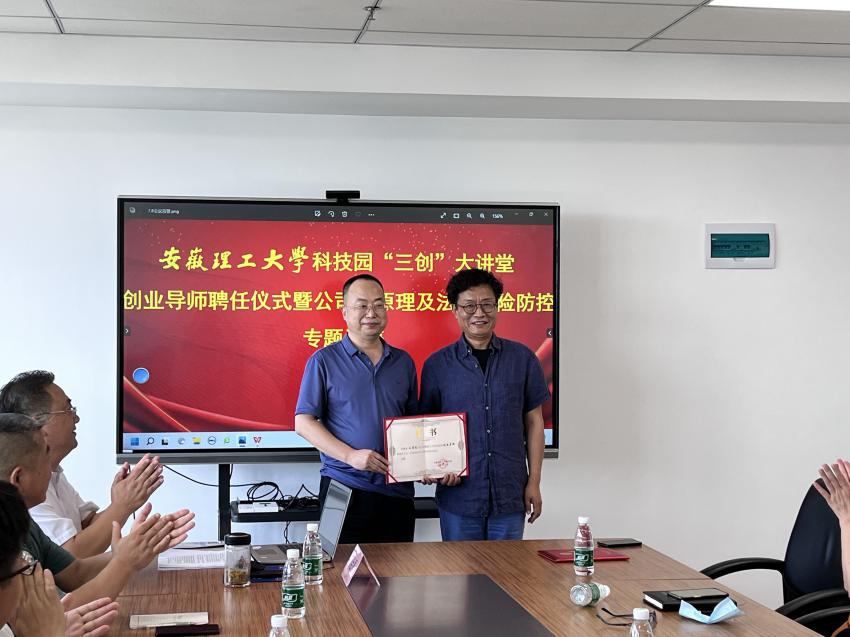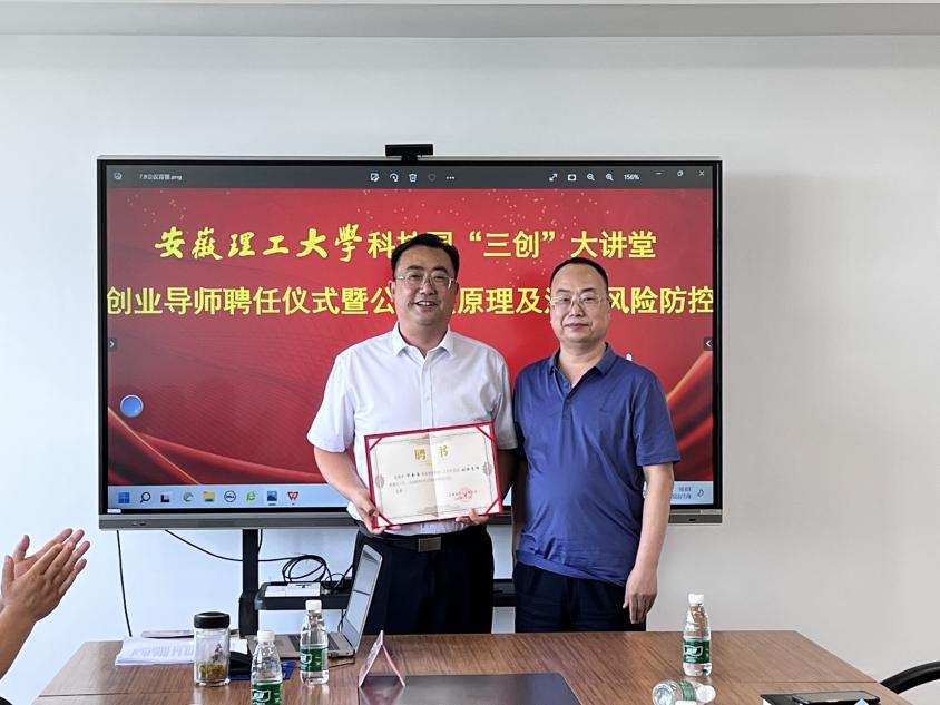 讲座结束后,大学科技园总经理黄绍服聘任安徽昌淮律师事务所主任万会昌、上海安达智能源有限公司负责人王勇俊为创业导师,并为两位创业导师颁发聘任证书。黄绍服对两位创业导师的加入表示热烈欢迎,指出大学科技园将继续建设创业导师队伍,加速聚集优质创新创业资源,为入园企业提供更加精准化服务。