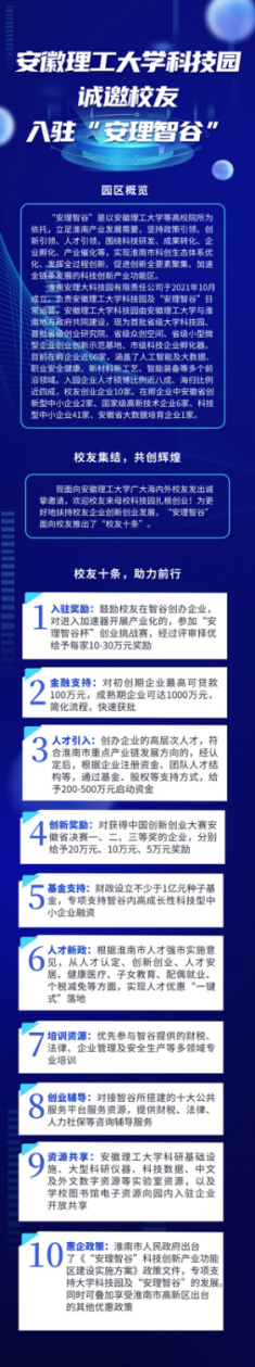 为吸引校友企业来淮创业,安徽理工大学科技园结合淮南市人民政府制定的《“安理智谷”科技创新产业功能区建设实施方案》,发布了针对校友企业的“校友十条”政策。该政策旨在为校友企业提供全方位的政策保障,吸引更多校友企业入驻“安理智谷”及大学科技园。